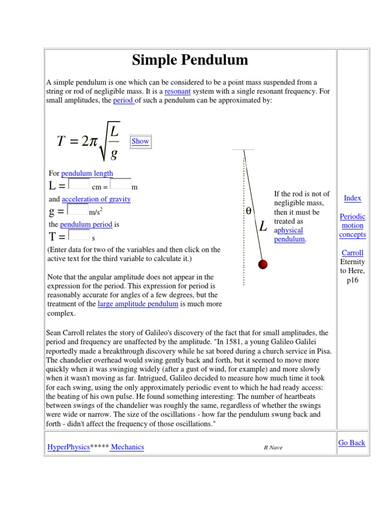 The model was supported by the data using a linear t with chi squared. Substituting this value of k into equation 2 the period of a simple pendulum can be found by m t 2π mg l 6 and t 2π g l. Many things in nature wiggle in a periodic fashion. The simple pendulum on graduateway huge assortment of free essays assignments the best writers.