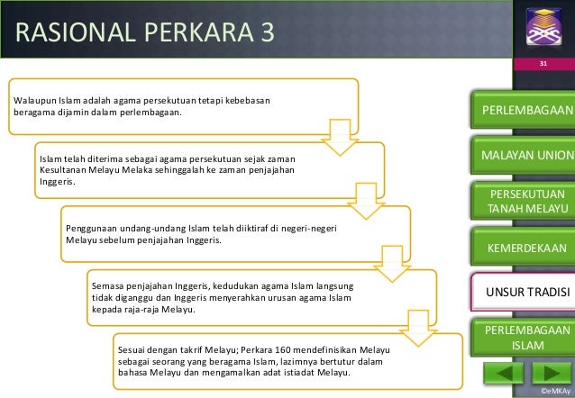 Agama islam sebagai agama rasmi perkara. Berikut merupakan senarai perkara perkara perlembagaan persekutuan yang disenaraikan mengikut empat cara pindaan. Oleh itu islam dilindungi oleh perlembagaan negara kita dan segala kemudahan serta perbelanjaan negara boleh dipergunakan untuk pembangunan islam tanpa dapat dicabar atau dipertikaikan. 99 amat menarik dimana beliau mengemuka serta menghurai dengan baik isu keistimewaan kedudukan agama islam di malaysia. Perkara 3 memperuntukkan islam ialah agama bagi persekutuan.