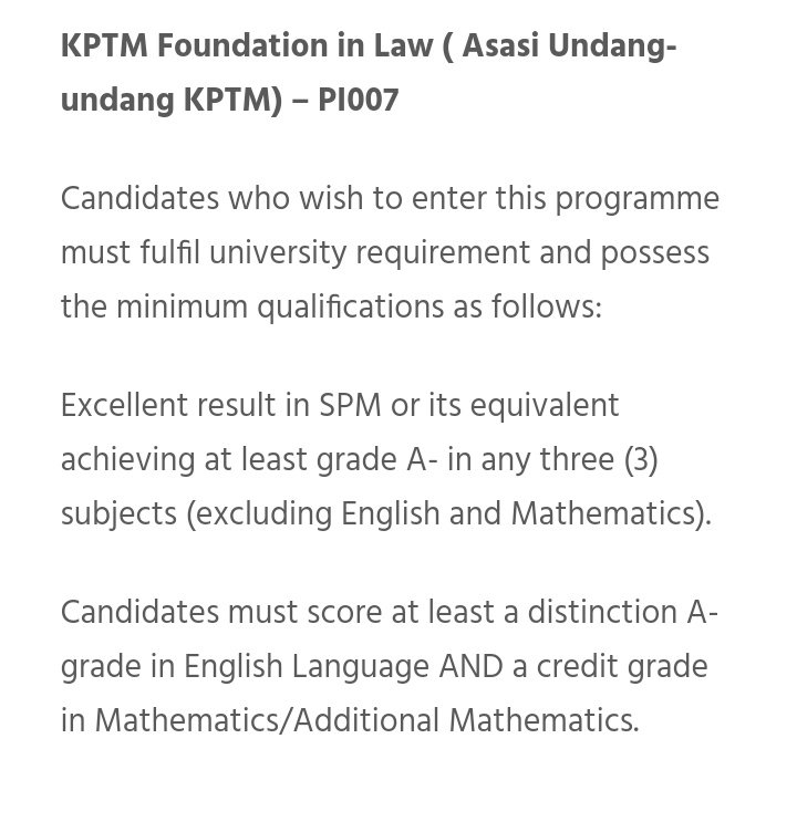 Kptm foundation in law asasi undang undang kptm pi007. Klu beli sendiri buku apa lagi yg patut dibeli ye. Mgikut kefahaman saya selepas sy tamat asasi ni sy kne go through upu all over again utk memohon mne2 universiti yg sy mahu termasuk uitm itu sendiri. Excellent result in spm or its equivalent achieving at least grade a in any three 3 subjects excluding english and mathematics.