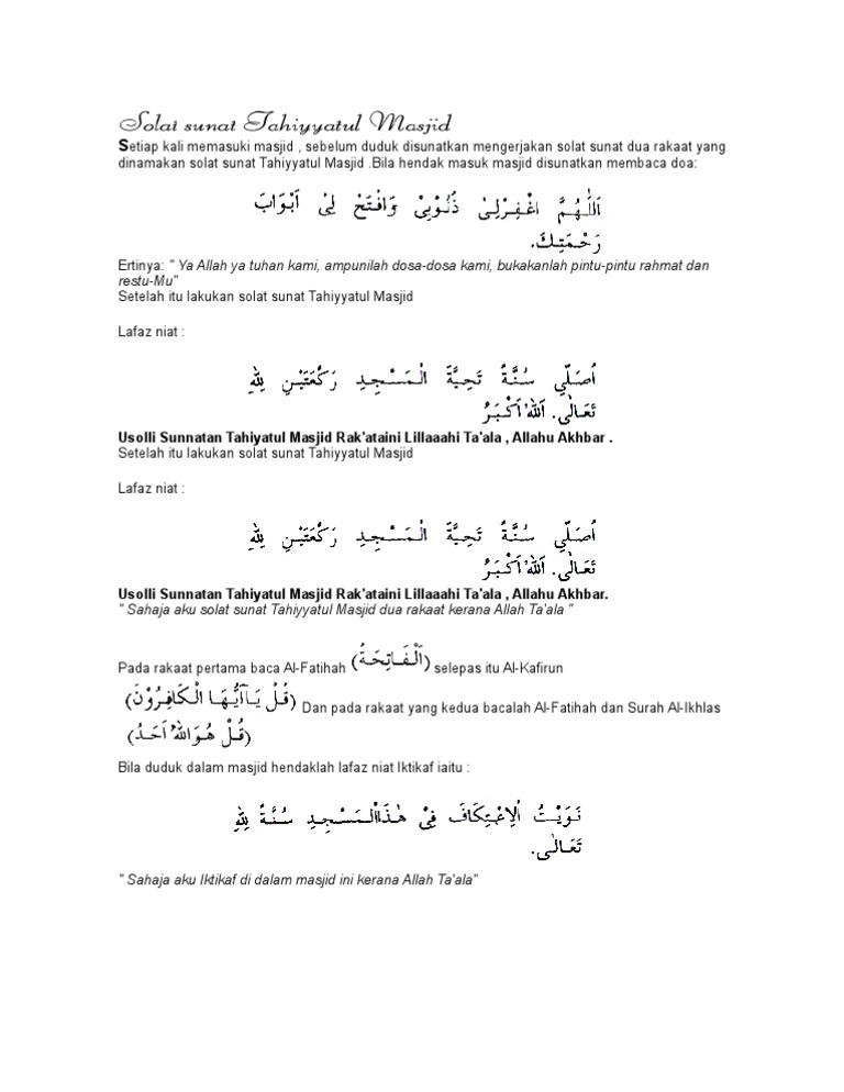 Niat sholat tahiyatul masjid adapun niat sholat tahiyatul masjid sebenarnya sah saja jika dicukupkan dengan usholli aku berniat shalat sebagaimana shalat sunnah mutlak namun. Sebelum duduk boleh terus mengerjakan solat sunat tahiyatul masjid dua raka at. Caranya sama dengan solat sunat yang lain hanya niatnya saja yang berbeza. Sholat ini bisa dilakukan mendekati waktu iqamah.