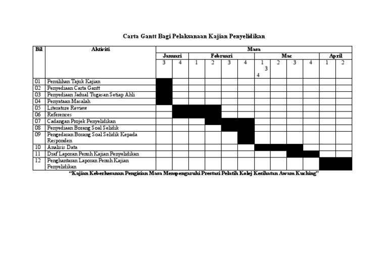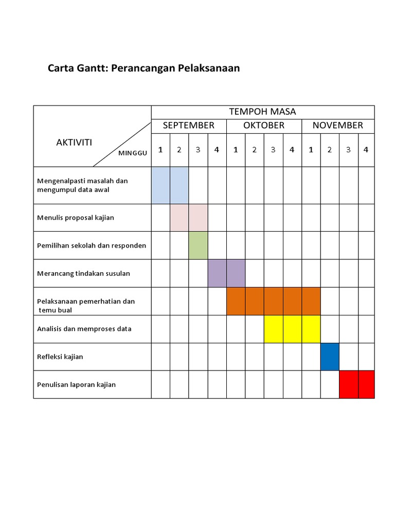 Carta gantt kajian tindakan. Contohu blogspot co id penyediaan kertas cadangan kajian tindakan source. Latihan ini boleh dijalankan selama 5 minit sebelum pembelajaran dimulakansemasa mata pelajaran bahasa malaysia. Sebelum membuat kajian tindakan adalah menjadi kewajipan kepada kita untuk membuat proposal kajian tindakan terlebih dahulu. Saya juga amat berharap agar dapat membina bahan powerpoint yang sama untuk murid menguasai kemahiran kemahiran perkataan yang lain dalam bahasa melayu khususnya murid murid pemulihan khas.