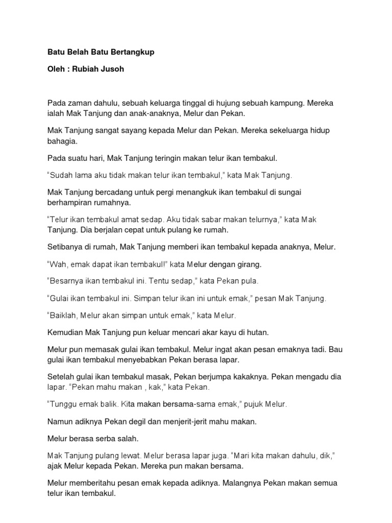 Cerita batu belah batu bertangkup dan pengajaran. Batu belah batu bertangkup mendapat nama sempena sebuah bongkah batu besar yang pada lagendanya mempunyai ruang mulut yang ternganga dan. Kisah batu belah batu bertangkup merupakan sebuah kisah lagenda yang terkenal buat masyarakat melayu batu belah batu bertangkup mendapat nama sempena sebuah bongkah batu besar yang pada lagendanya mempunyai ruang mulut yang ternganga dan terbuka seperti sebuah gua atau batu terbelah dua namun mengeluarkan suara yang kuat dan menyeramkan dikatakan ia telah menelan ramai manusia yang memuja. Ia meceritakan tentang kisah sepasang suami isteri yang miskin si kantan suami dan si tanjung isteri yang dipercayai menetap di bukit berapit kira kira sebatu dari pangkalan kapar klang. Batu belah batu bertangkup didakwa wujud di dalam satu kawasan penempatan di klang selangor yang dipercayai masyarakat setempat mengenai kisah misterinya.