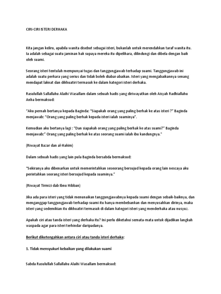 Ciri ciri isteri nusyuz. Keluar dari rumah tanpa keizinan suaminya terkecuali daripada keadaan ini apabila isteri keluar berjumpa qadi untuk menuntut hak mencari nafkah apabila suami tidak berkemampuan memberi nafkah kepadanya meminta fatwa atau hukum jika sekiranya suaminya bukan seorang faqih dalam bidang agama. Antara bentuk bentuk nusyuz seorang isteri adalah. Dalam surah an nisa ayat 128 allah swt berfirman yang bermaksud. Tetapi ianya di kecualikan bagi sesuatu keadaan seperti isteri keluar berjumpa qadi hakim untuk menuntut haknya daripada suami.
