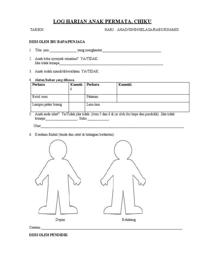 Buku log harian kanak kanak mengandungi bahagian yang perlu diisi oleh ibubapa dan sebahagian lain yang perlu dicatatkan oleh pengasuh pendidik di taska. Harga pasaran buku log harian sekarang ialah antara rm12 hingga rm20 sebuah bagi kegunaan 3 6 bulan. Cara menulis catatan aktiviti1. Keadaan kesihatan dan fizikal kanak kanak ketika tiba di taska 3.