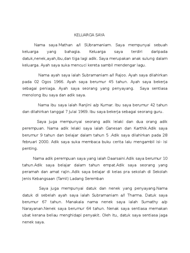 Contoh karangan keluarga saya tahun 1. Nama ibu saya ialah rohana binti ismail ibu saya berumur 42 tahun dan dilahirkan tanggal 7 julai 1969. My family call me lisa at home and my companions call me elza at school. Beliau seorang guru yang mengajar di sjk chung hua krokop yang terletak berhampiran dengan rumah kami. Aku sebatang pokok pisang.