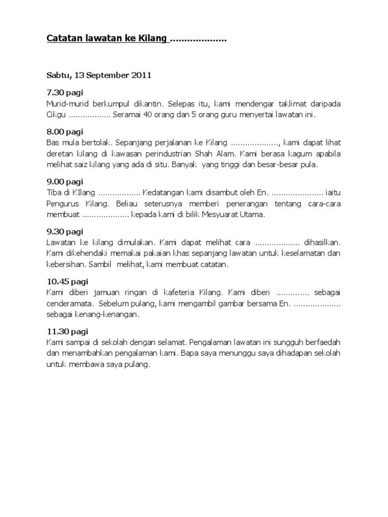 Contoh karangan laporan lawatan sambil belajar ke kilang roti. Pada hari sabtu 29 februari 2012 yang lalu persatuan bahasa malaysia sekolah kebangsaan padang air kemaman telah mengadakan lawatan sambil belajar ke pameran buku di dewan pusat dagangan terengganu. Sebagai setiausaha persatuan bahasa melayu kamu dikehendaki menulis sebuah laporan tentang lawatan tersebut. Pada 20 mac 2019 persatuan bahasa malaysia sjk c chung hwa. Selamat belajar dan mengulangkaji pelajaran.