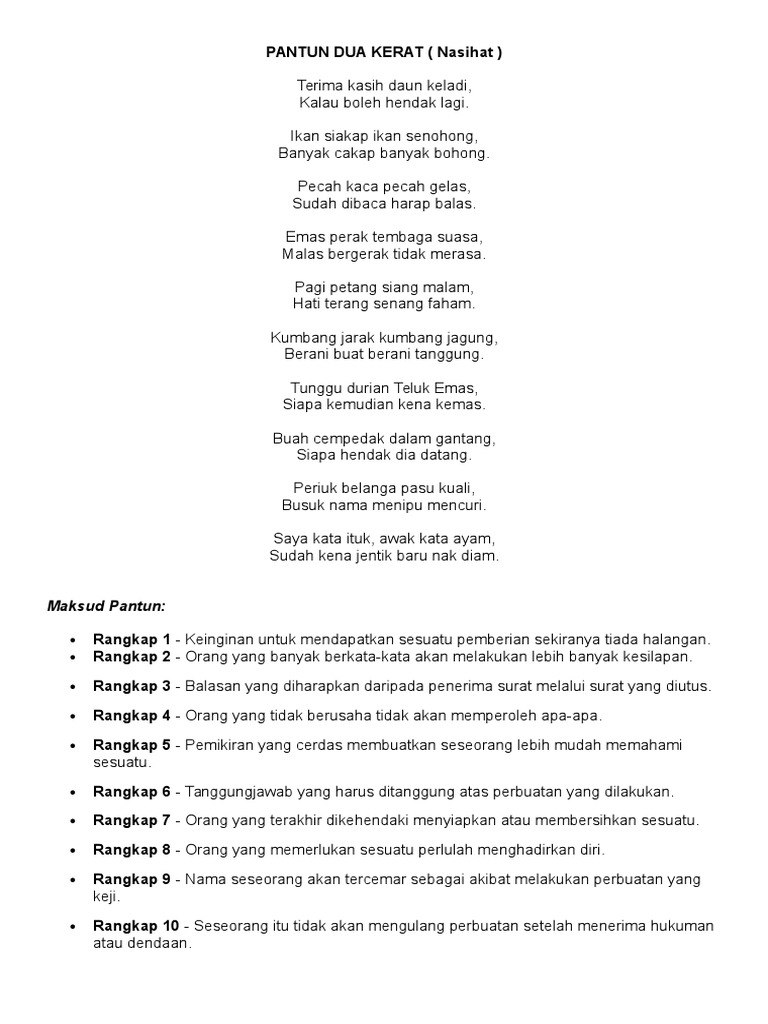 Di zaman dahulu pantun diungkapkan dengan lisan terutama oleh masyarakat melayu di indonesia namun seiring berjalannya waktu pantun juga diungkapkan melalui tulisan seperti di buku maupun surat kabar. Unknown december 18 2013 at 12 11 am. Pantun dua kerat nasihat antologi kuingin berterima kasih tingkatan 1. Tapi tidak semua orang dapat membuat pantun.