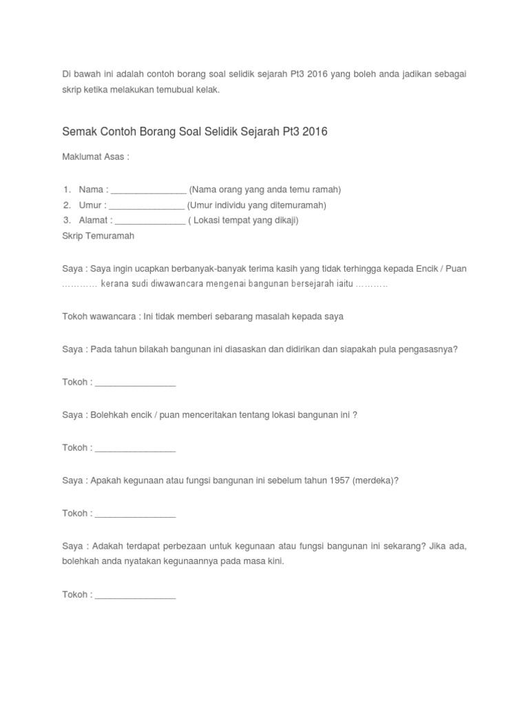 Contoh kerja kursus sejarah pt3 2019 paling tepat essay. Contoh skrip temu bual orang sumber sekolah kebangsaan kodiang saya. Contoh borang soal selidik sejarah pt3 2019.
