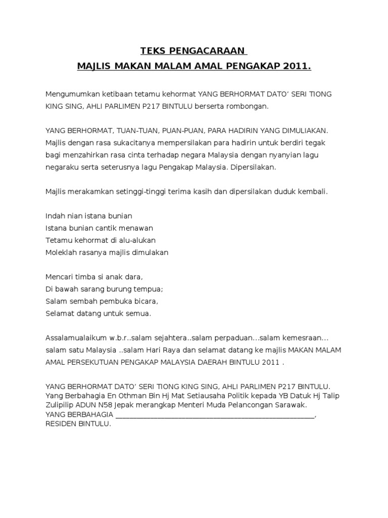 Teks ucapan mc malam sua mesrasuhana mohon perhatian majlis akan bermula sebentar lagi diharap para hadirin dapat mengambil tempat masing masing. Teks ucapan pengacara majlis makan malam mpv 2004. Contoh teks ucapan alu aluan dari presiden kelab permotoran ucapan alu aluan dari presiden cec. Dato hon choon kim berserta rombongan.
