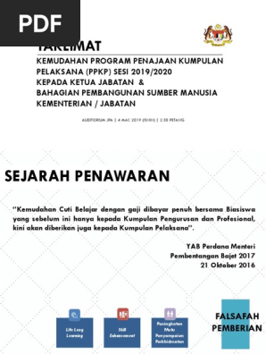 Permohonan cuti belajar bergaji penuh kepada pegawai perkhidmatan pendidikan bagi pengajian ijazah sarjana dan kedoktoran tahun 2017 kementerian pendidikan malaysia kpm mempelawa pegawai perkhidmatan pendidikan ppp yang sedang berkhidmat dan berkelayakan untuk memohon cuti belajar bergaji penuh bagi mengikuti pengajian peringkat ijazah sarjana atau kedoktoran secara sepenuh masa di. Tahun 2017 kerajaan memberi ruang kepada kumpulan pelaksana untuk menyambung pelajaran dengan diberikan cuti belajar bergaji penuh dengan biasiswa. Tawaran cuti belajar bergaji penuh cbbp tanpa hlp cuti belajar tanpa gaji cbtg bagi pengajian kursus sarjana phd sesi 2018 2019 bil 2 2017 tarikh. Berikut merupakan syarat panduan permohonan untuk permohonan program cuti belajar bergaji penuh.