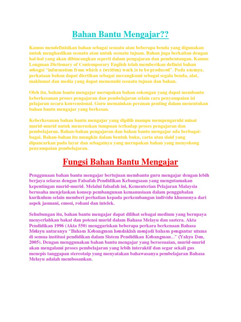 Seterusnya alat bantu mengajar juga dapat ditakrifkan sebagai audio visual dan bahan bahan yang berkaitan dengannya yang berfungsi dalam perlaksanaan sesuatu pengajaran yang mana juga dikenali sebagai sebahagian daripada media pengajaran heinich e t al 2002. Tidak semestinya alat yang kita susah payah reka itu berjaya menjalankan fungsinya dengan baik sebagai alat bantu mengajar kerana alat bantu mengajar bukanlah tentang kecantikannya tetapi fungsinya. Bahan bantu mengajarpengenalan menurut brown j w. Alat alat bantu itu dimaksudkan untuk memberikan pengalaman lebih konkrit memotivasi serta mempertinggi daya serap dan daya ingat siswa dalam belajar.