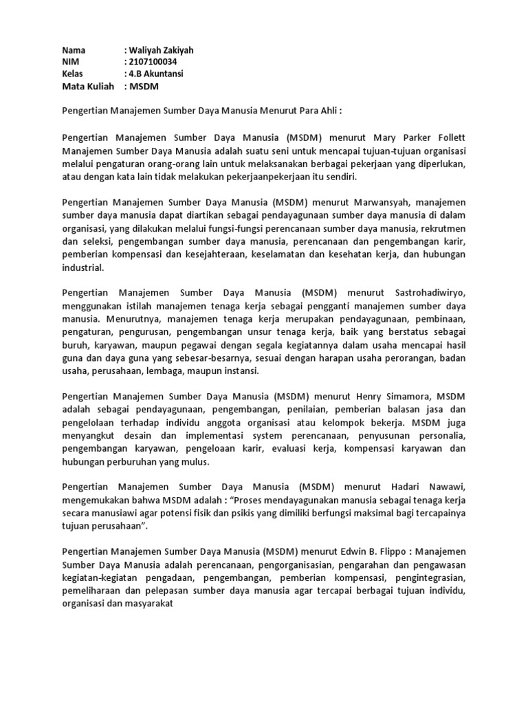 Menurut pendapat dari sofyandi sebagai suatu strategi dalam menerapkan fungsi fungsi manajemen yaitu planning organizing leading and controlling dalam setiap aktifitas atau fungsi operasional sumber daya manusia mulai dari proses penarikan seleksi pelatihan dan pengembangan penempatan yang meliputi promosi demosi dan transfer penilaian kinerja pemberian kompensasi. Mary parker follet 1868 1933 menyatakan bahawa pengurusan adalah sebagai seni untuk mencapai sesuatu melalui orang lain. Satu ciri utama pengurusan sumber manusia yang dikenalpasti oleh beberapa penyelidik ialah penekanan kepada integrasi dasar dan amalan personel dengan strategi. Definisi pengurusan sumber manusia menurut bohlander et al 2001 pengurusan sumber manusia merangkumi penggabungan semua tenaga kerja yang pelbagai untuk mencapai matlamat bersama.