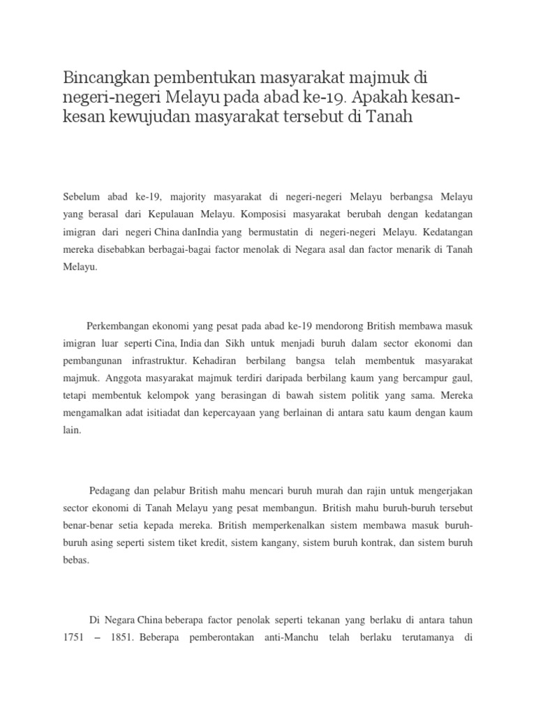 Malaysia amat terkenal dengan adanya masyarakat majmuk yang berbilang kaum. Membincangkan kesan perubahan ke atas masyarakat di malaysia ekoran daripada kemasukan imigran ke tanah melayu. Proses ini berterusan sehingga penjajahan british di tanah melayu. Faktor kewujudan masyarakat majmuk di malaysia dan kesannya dalam sistem sosial ras kumpulan etnik budaya bahasa kepercayaan agama ideologi ciri ciri masyarakat majmuk keunikan masyarakat majmuk di malaysia dicirikan dari segi.