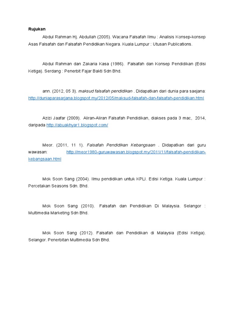 Keempat empat falsafah yang telah dibincangkan ini boleh dikatakan sebagai asas kepada falsafah pendidikan kebangsaan. Selaras dengan rukunnegara falsafah pendidikan ini turut menekankan prinsip kepercayaan dan kepatuhan. Menghasilkan kitab dalam bidang teologi falsafah sains dan ilmu sufi. Buku falsafah dan pendidikan di malaysia edisi ketiga ini dihasilkan berdasarkan sukatan pelajaran proforma kursus yang ditawarkan dalam program ijazah sarjana muda perguruan pismp di institut pendidikan guru malaysia ipgm.