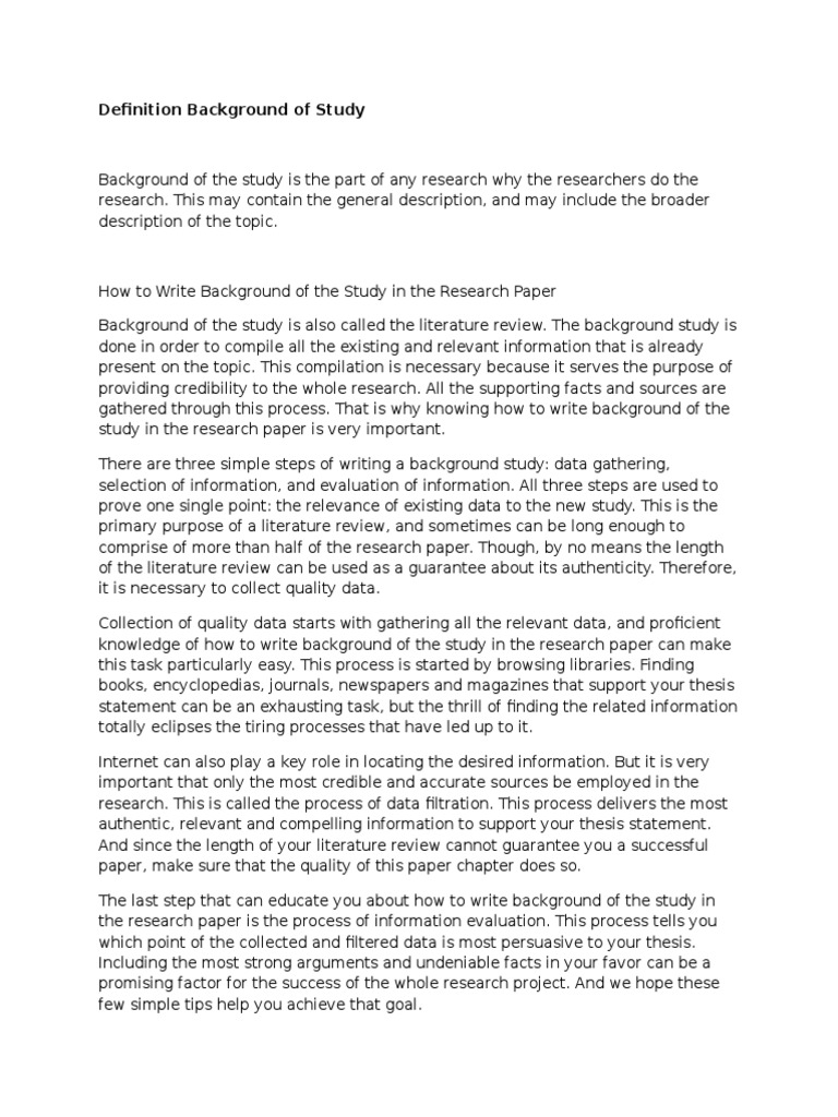 The purpose of a background study is to help. Thus the background of the study generates the reader s interest in your research question and helps them understand why your study is important. How to write the background section of a simple research article the background section is important. The background of a study is an important part of the research paper.