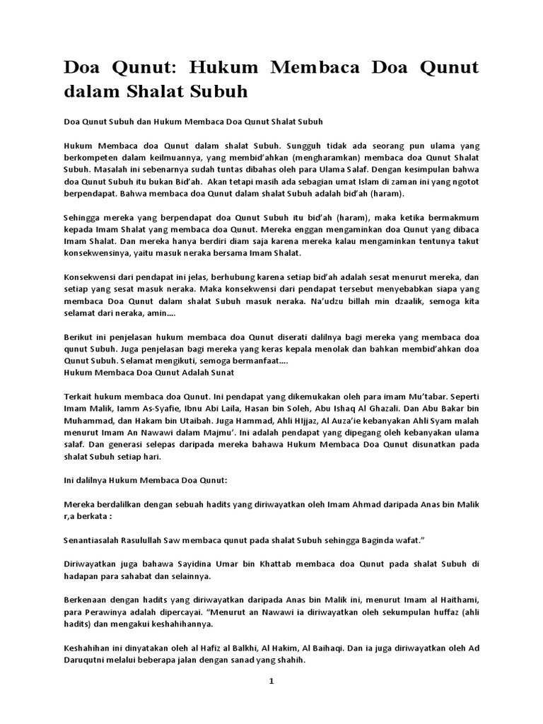 Karena nabi mengajarkan doa qunut dan sebagian sahabat. Doa yang secara redaksional mengandung makna permintaan seorang hamba agar senantiasa diberikan petunjuk keberkahan dan segala macam bentuk kebaikan dari tuhannya yang maha pemberi. Adapun hukum membaca doa qunut adalah sunnah muakkad ab ad atau sunnah yang diperkuat. Bincangsyariah com sudah menjadi kebiasaan bagi mayoritas muslim indonesia ketika itidal pada rakaat kedua salat subuh untuk membaca doa yang lazim disebut dengan doa qunut.