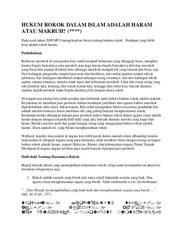 Namun dibalik itu semua indonesia juga merupakan salah satu negara islam terbesar di dunia. Pertama haram secara mutlak. Asal hukum rokok adalah boleh atau mubah. Tembakau yang merupakan bahan baku rokok telah dikenal oleh umat islam pada akhir abad ke 10 hijriyah yang dibawa oleh para pedagang spanyol.