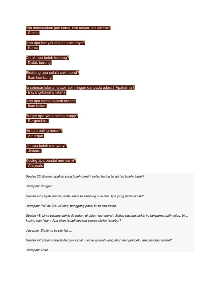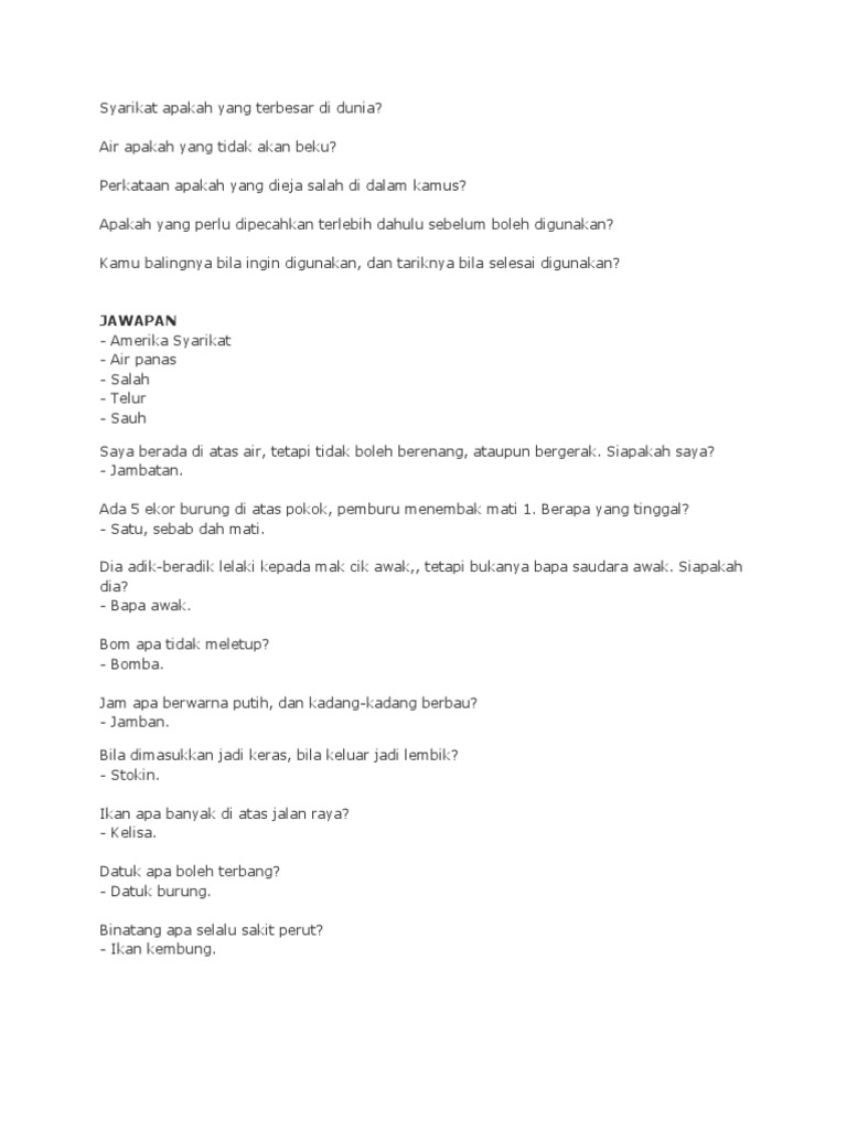 Ikan apa banyak di atas jalan raya. Berdiri tapi tidak punya kaki bertubuh karena musyawarah orang orang. Kelakuan makan di jalan raya ini mencuri perhatian publik. Binatang apa selalu sakit perut. Pasar apa yang tidak jual sayur mayur.