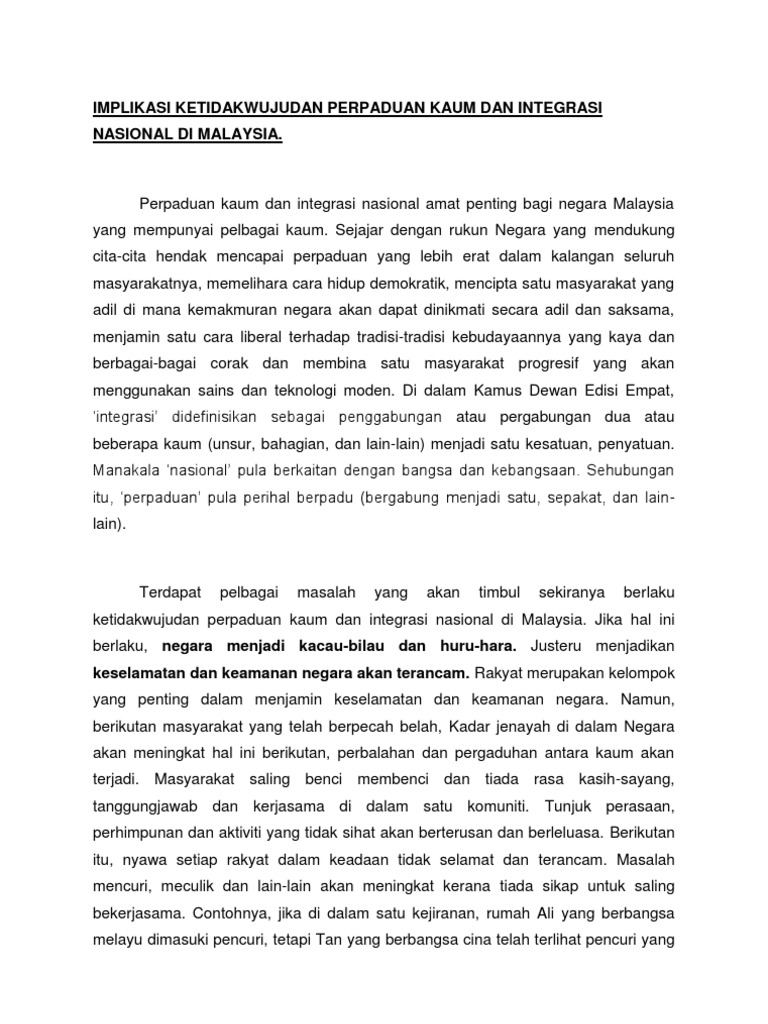 Integrasi dan perpaduan kaum memainkan peranan yang sangat besar dalam memajukan negara. Integrasi kaum ini terjadi dari dulu lagi disebabkan pendidikan berorientasikan kaum. 2289 8042 vol 3 bil 1 jun 2016 kedatangan islam ke tanah melayu melalui negara cina india dan juga arab. Integrasi nasional merujuk kepada satu proses dinamik untuk merapatkan masyarakat negeri negeri dalam malaysia khususnya di antara negeri negeri di semenanjung dengan negeri sabah dan sarawak untuk membentuk satu bangsa malaysia yang mempunyai identitinya sendiri berteraskan perlembagaan persekutuan dan rukun negara.