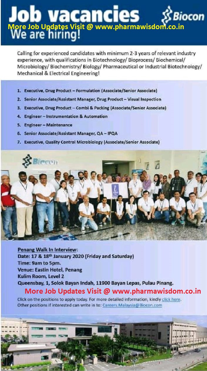Biocon Limited Abroad Walk In Interviews For Multiple Openings Qa Qc Micro Maintenance Packing Drug Product Instrumentation On 17th 18th Jan 2020 Pharma Wisdom