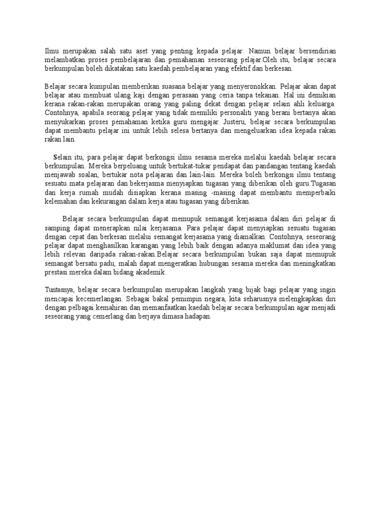 1 tidak mensia siakan biar pun seminit seorang pelajar yang cemerlang menggunakan masa yang terluang masa pertukaran kelas masa menunggu kereta sewa masa sebelum hidangan makanan. Salah satu cara yang efektif lagi pragmatik yang telah diabaikan oleh generasi muda untuk belajar dengan berkesan ialah mengamalkan gaya hidup sihat. Kaedah ini lebih efektif berbanding dengan kaedah biasa kerana kita dapat menyeimbangkan pengguanaan otak kiri dan otak kanan. Contoh karangan bahasa melayu pt3 ini bukan sekadar untuk dibaca tetapi perhatikan setiap penggunaan ayat kata wacana penyelitan peribhasa dan gaya bahasa yangmenarik digunakan dalam karangan ini.