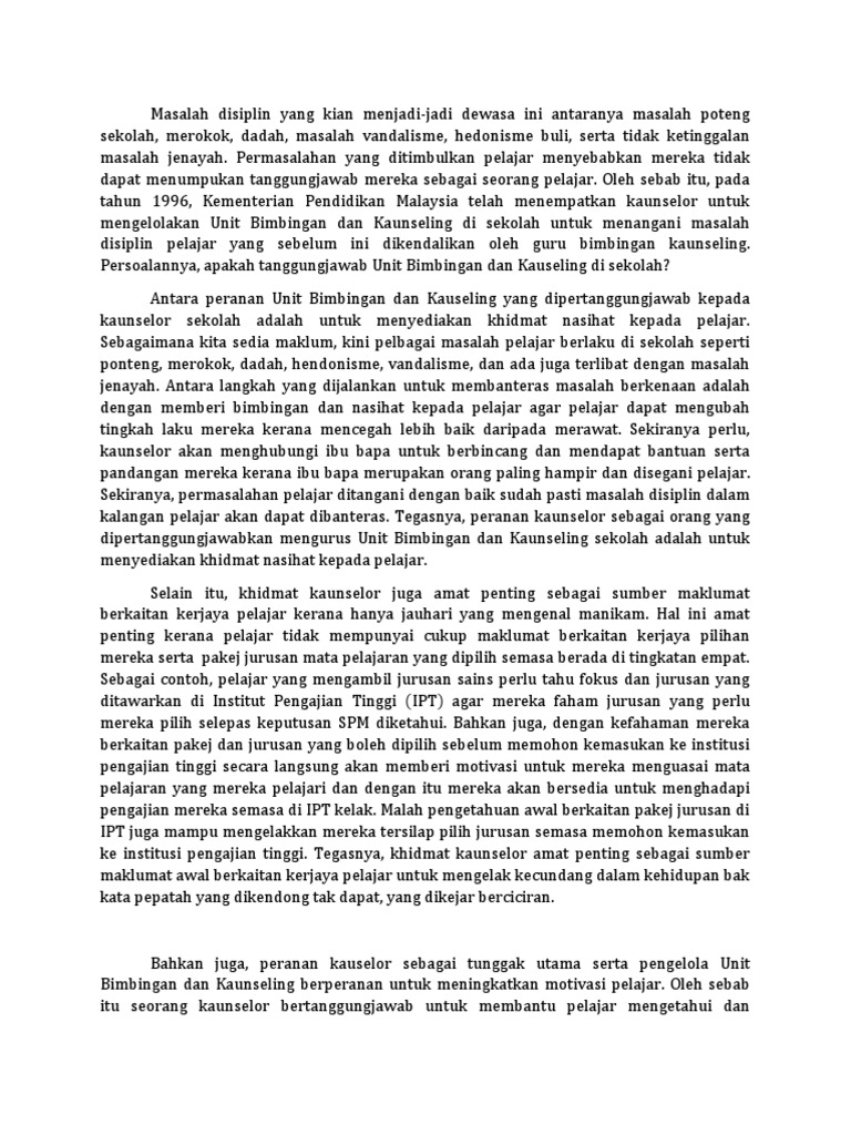 Karangan peranan unit bimbingan dan kaunseling di sekolah. Ia juga merupakan proses yang dirancang dan berterusan. Justeru sebagai seorang murid atau remaja sekolah terdapat beberapa peranan yang dapat saya sumbangkan untuk membantu pihak sekolah dalam membanteras salah laku disiplin rakan rakan di sekolah saya. Persoalan ini akan dibincangkan secara terperinci hingga ke akar umbi sebentar lagi. Seterusnya peranan guru bimbingan dan kaunseling di sekolah hendaklah diperhebat.