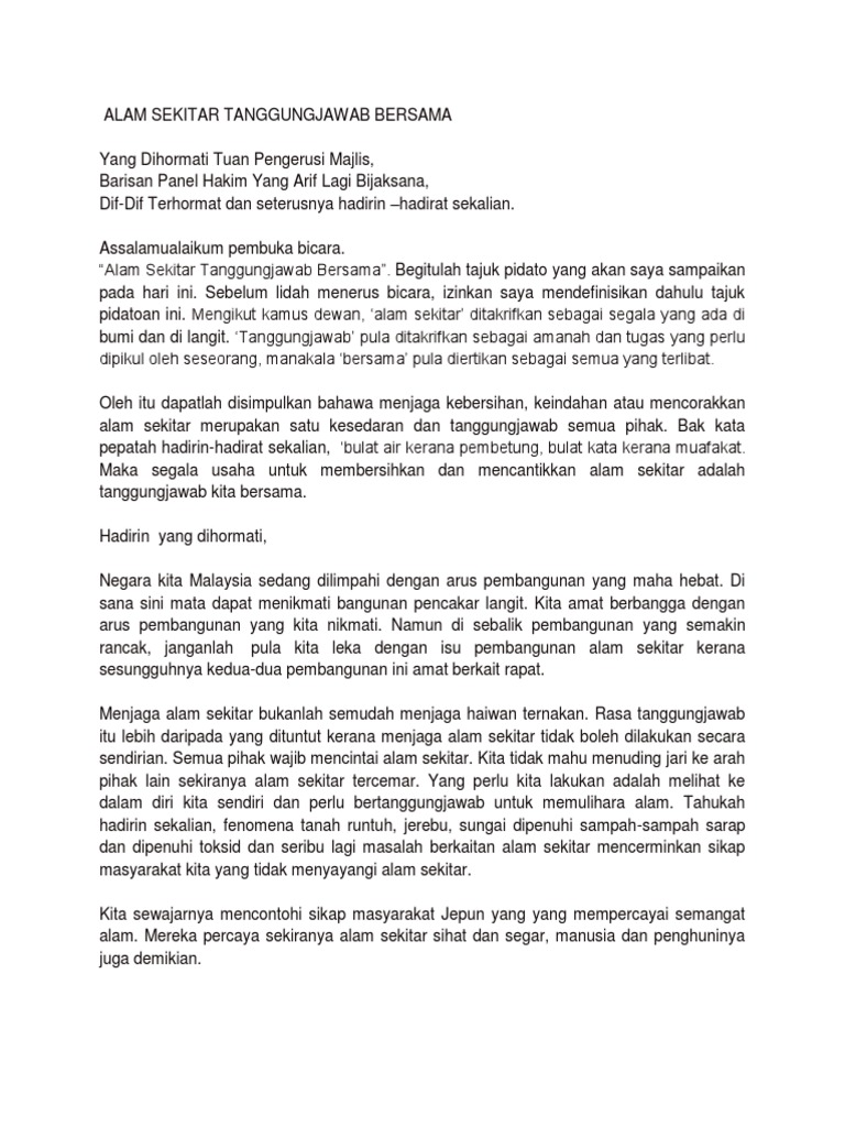 Hadirin sekalian alam sekitar adalah sumber keperluan hidup kita. Alam sekitar seharusnya dijaga kerana alam sekitar bukan hanya digunakan pada masa sekarang tetapi akan digunakan sehingga beratus ratus tahun lagi. Begitulah tajuk pidato yang akan saya sampaikan pada hari ini. Tema soalan penulisan karangan bahasa melayu yang berkaitan penjagaan alam sekitar lazim menjadi soalan pilihan di dalam peperiksaan.