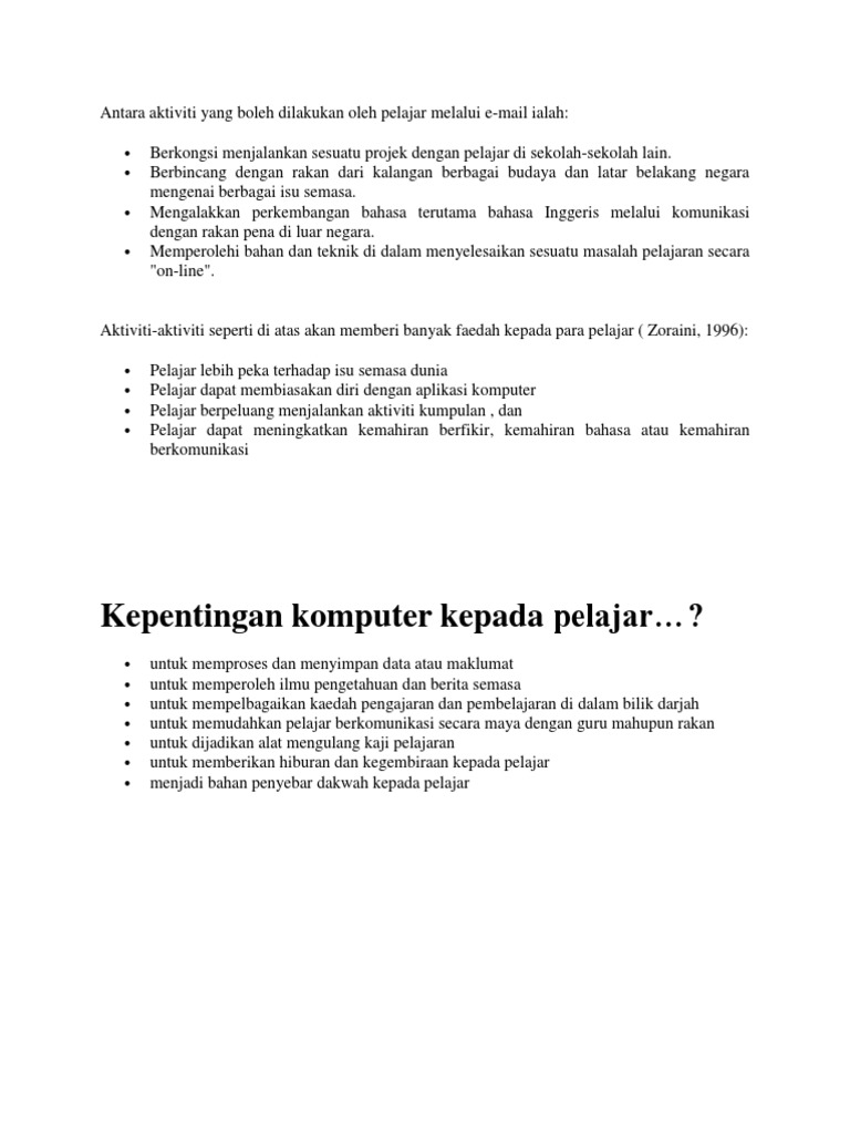 Dari zaman falsafah ke zaman renaissance bertukar pula ke zaman industri dan zaman atom kini sampailah pada hari ini. Tajuk soalan penulisan karangan berkaitan faedah atau manfaat seharusnya mudah bagi pelajar kerana ia memerlukan huraian berkaitan topik tersebut dan kesannya terhadap golongan yang dimaksudkan dalam soalan. Banyak kerja menaip menyiapkan laporan kini dilakukan dengan bantuan komputer. Kini boleh dikatakan ramai dalam kalangan murid sekolah telah mahir dalam menggunakan computer seperti kata kata peribahasa alah bisa tegal biasa.