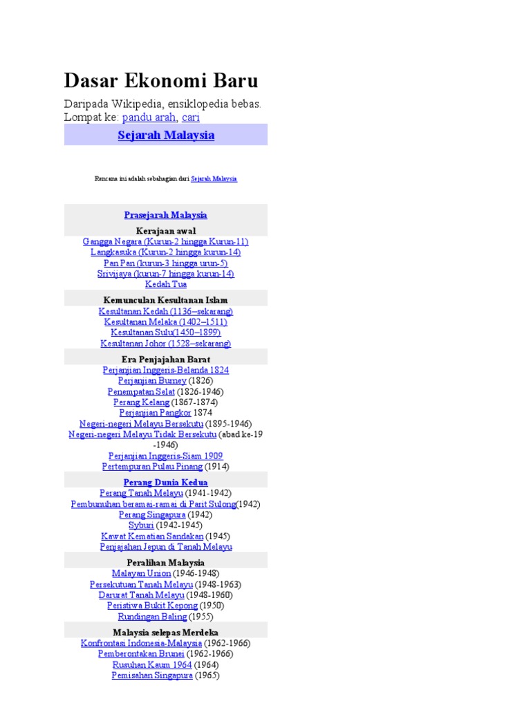 10 1 pengenalan selepas merdeka sehingga kini pelbagai dasar yang telah dibentuk oleh kerajaan dasar ekonomi baru dasar pelajaran kebangsaan dasar kebudayaan kebangsaan dan wawasan 2020 menerangkan tentang definisi dan kepentingan dasar. Dasar yang dikenali sebagai dasar ekonomi baru ini adalah satu dasar yang dilancarkan oleh kerajaan dalam tahun 1970 melalui rancangan malaysia kedua 1971 1975 untuk membetulkan ketidakseimbangan sosial ekonomi yang wujud di malaysia di antara kaum kaum di. Matlamat utamanya ialah perpaduan negara selain itu juga bertujuan untuk menyusun semula ketidakseimbangan sosio ekonomi yang wujud di negara ini. Dilihat dari perspektif sejarah malaysia penjajah.