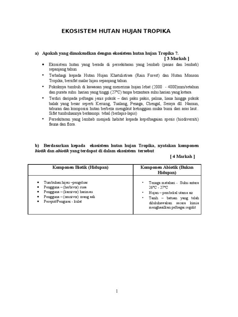 Kepentingan hutan hujan tropika kepada alam sekitar fizikal manusia 1. Hutan telah meliputi keluasan muka bumi sebanyak lima puluh peratus. Kawasan hutan hujan tropika kebanyakkan terletak di garisan lintang 5 darjah utara ataupun 5 darjah selatan iaitu kawasan yang beriklim panas dan lembab sepanjang tahun iklim khatulistiwa. Ekosistem ialah satu proses interaksi antara benda benda hidup dengan benda benda hidup dengan benda benda bukan hidup yang wujud dalam alam sekitar.