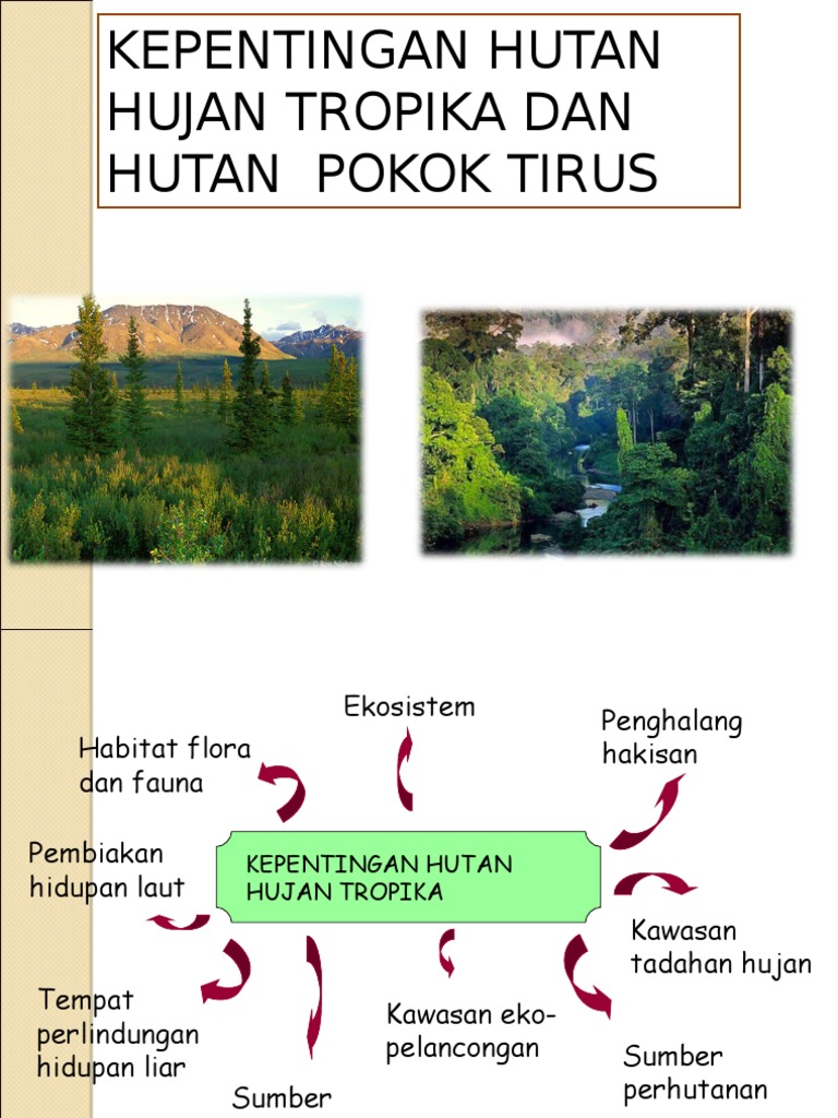 Kepentingan hutan hujan tropika kepada ekosistem. Kepentingan hutan paya bakau kepada manusia 1. Hutan perlu dikekalkan untuk memberi keseimbangan ekosistem alam. Antaranya ialah hutan hujan tropika hutan bakau hutan pokok tirus hutan pokok daun luruh dan sebagainya. Hutan berfungsi sebagai habitat kepada pelbagai hidupan liar miaslnya hutan hujan tropika seluas 0 5 bilion hektar di kawasan amazon mempunyai berjuta spesies haiwan dan 1500 jenis tumbuhan haiwan haiwan ini hidup membesar dan membiak dengan sempurna di dalam kawasan hutan yang ekosistemnya stabil hutan menjadi habitat utama untuk haiwan membentuk linkungan dan meneruskan generasi tumbuhan.