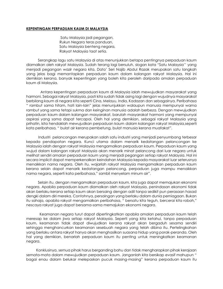 Kepentingan mengamalkan perpaduan kaum dalam kalangan masyarakat. Masyarakat yang harmoni dapat dilahirkan jika kaum kaum di malaysia dapat menerima antara satu sama lain tanpa wujud prasangka dan pergeseran sehingga boleh menimbulkan konflik antara kaum. Perpaduan kaum juga memainkan peranan dalam mengukuhkan lagi ekonomi negara dengan penglibatan semua kaum dalam kegiatan ekonomi. Contoh karangan perpaduan kaum dalam masyarakat. Dasar tersebut akan berkuatkuasa mulai tahun 2013.