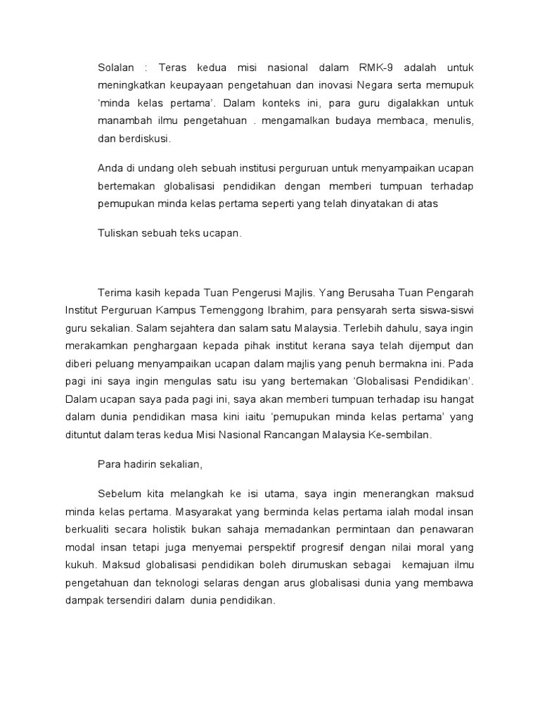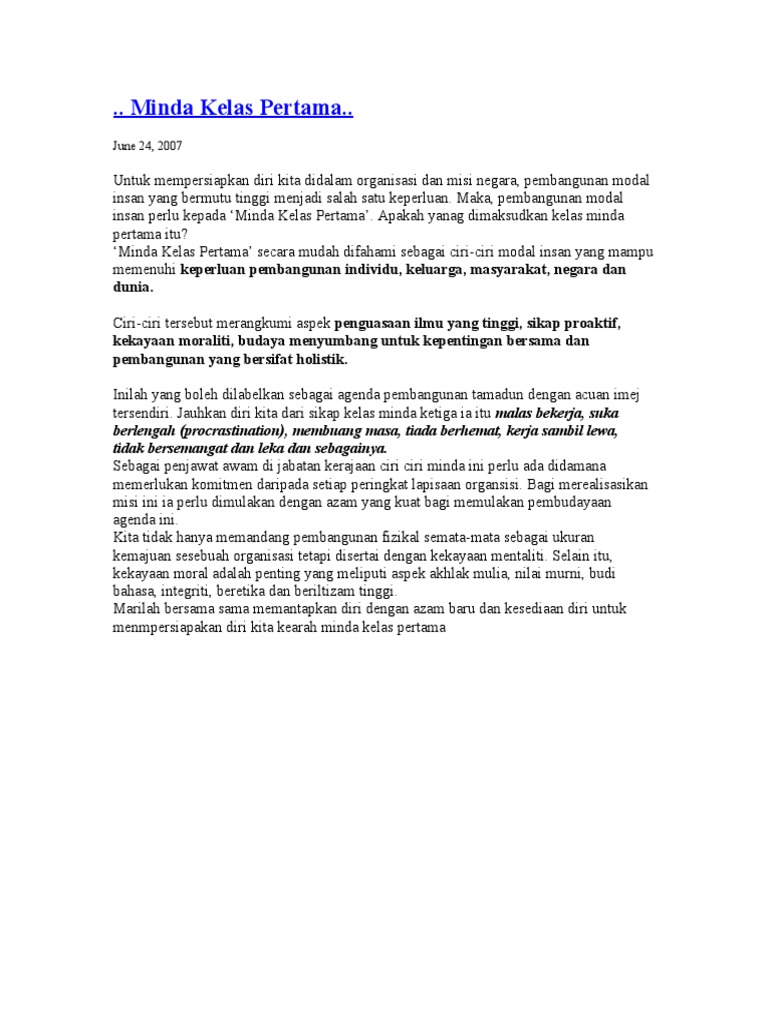 Kepentingan modal insan kelas pertama. Modal insan 34 2 9 minda kelas pertama 37 2 10 ciri ciri minda kelas pertama 38 2 11 pembentukan minda kelas pertama 40 2 12 penerapan minda kelas pertama dalam pendidikan 42 2 13 kepentingan penerapan minda kelas pertama 44 2 14 penutup 45. Secara ringkas ciri ciri modal insan berminda kelas pertama mampu memenuhi keperluan pembangunan individu keluarga masyarakat negara dan dunia. Sesungguhnya guru yang baik akan melengkapkan diri dengan pelbagai ilmu pengetahuan dan kemahiran serta peka terhadap perkembangan pendidikan terkini dari semasa ke semasa mengikut perkembangan zaman. Sukar untuk melahirkan masyarakat yang benar benar seimbang dan bermodal insan betapa perlunya minda kelas pertama dicorak dengan intipati akhlak dan moral yang sejati serta mengikis tradisi individualisme dalam jiwa manusia dalam usaha kita membina modal insan yang sebenar benar insaniah.