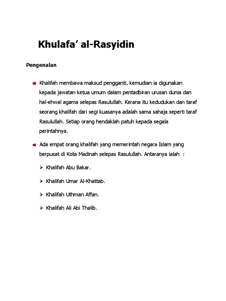 Khalifah orang yang memegang jawatan ketua negara islam. Kemajuan ekonomi di zaman khulafa ar rasyidin. Khulafa al rasyidin الخلافة الراشدة al khilãfah ar rãšidah merupakan yang pertama daripada empat khilafah utama yang ditubuhkan selepas kewafatan muhammad tampuk kepimpinan dipegang oleh empat khalifah pengganti muhammad selepas kewafatannya pada 632 m atau 11 h. Pertambahan harta negara hasil kutipan zakat jizyah.