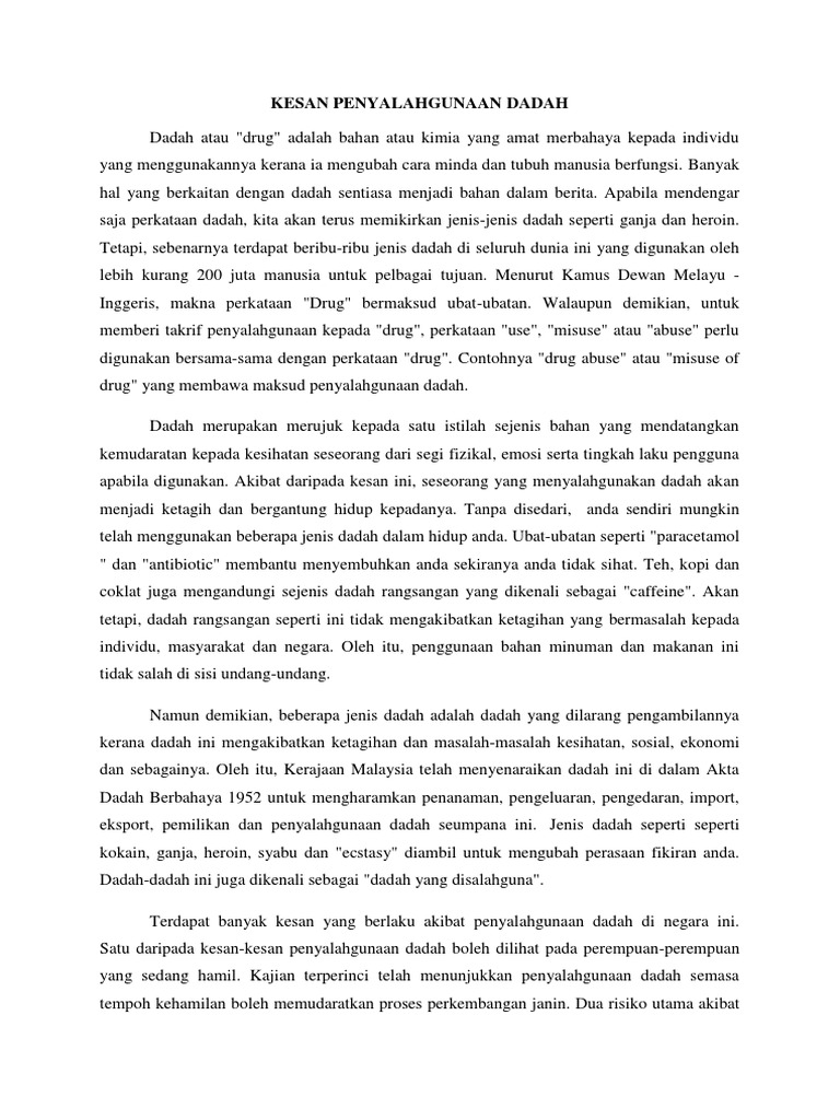 Penyalahgunaan dadah juga memberi kesan kepada produktiviti dan kejayaan anda di tempat kerja dan di sekolah. Kesan buruk ketagihan dadah berbeza dari seorang individu dengan seorang yang lain secara amnya kesan kesan dadah adalah seperti berikut. Namun di sebalik semua kemajuan ini terdapat pelbagai masalah yang perlu dihadapi. Kesan penyalahgunaan dadah terhadap kesihatan dadah adalah bahan kimia yang boleh mengubah fungsi dan fisiologi badan digunakan untuk merawat pesakit penyalahgunaan berlaku bila digunakan selain dari tujuan perubatan penyalahgunaan dadah boleh menyebabkan ketagihan dan menjejaskan kesihatan bab 3.