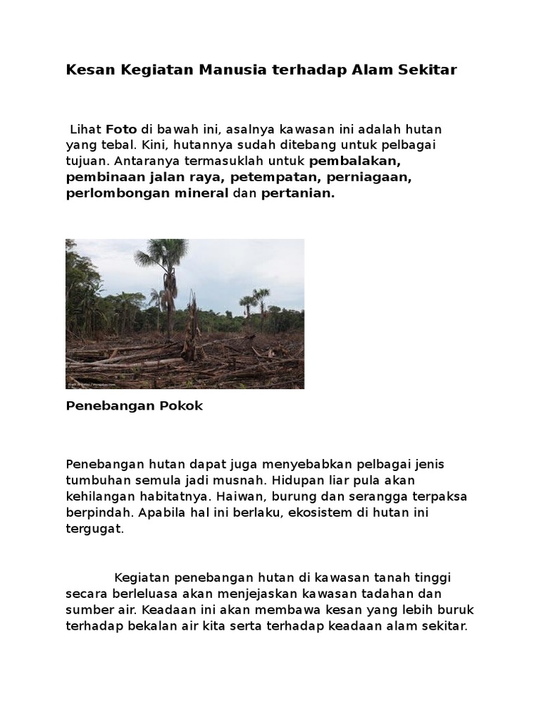 Pelepasan karbon dioksida yang tinggi di udara dan atmosfera menyebabkan tumbesaran pokok yang luar biasa jerebu dan asap mengurangkan kadar penerimaan cahaya matahari kepada tumbuh tumbuhan dan merosakkan pokok. Start studying geografi bab 8. Pembinaan empangan 1 pembinaan empangan boleh mengakibatkan kepupusan flora dan fauna 2 ianya juga boleh mengancam hidupan akuatik yang hidup 3 ianya juga akan menyebabkan landskap hutan berubah langkah langkah mengurangkan kesan kegiatan manusia terhadap alam sekitar. Kesan guna tanah terhadap alam sekitar perindustrian pertanian pembinaan jalan raya perlombongan guna tanah didefinasikan sebagai kepelbagaian aktiviti yang dijalankan oleh manusia untuk mengubah landskap ruang tanah tersebut termasuklah aktiviti perburuan dan pembajakan.
