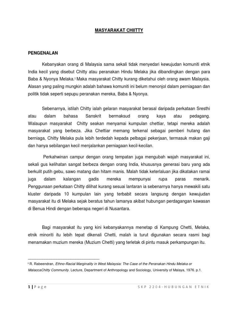 Namun terdapat juga sebahagian golongan pedagang ini berasal dari daerah orissa dan andhra pradesh sumber temu bual encik nadarajan raja 2016. Menyatakan bangsa melayu itu adalah penduduk yang mendiami asia tenggara dan pulau pulau dekatnya. Budaya dan kesenian kemunculan komuniti baba dan nyonya terutama sekali di melaka dan cina peranakan di kelantan suatu interaksi yang ketara dalam masyarakat melayu. Rumusan terdapat banyak persamaan corak kehidupan masyarakat chetti dengan masyarakat kaun melayu.