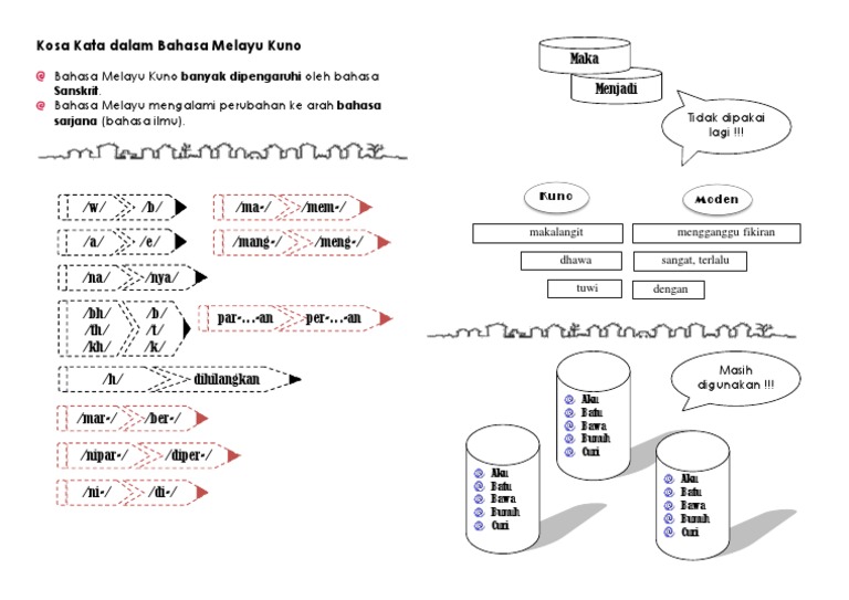 Kosa kata bahasa melayu kuno. Ciri ciri bahasa melayu klasik ayat panjang berulang pasif dan berbelit belit. Bahasa sanskrit dikatakan banyak mempengaruhi kosa kata dalam bahasa melayu. Kesan daripada bahasa sanskrit ini menyebabkan penambahan kosa kata bahasa melayu kuno. Pada masa inilah bahasa melayu mengalami evolusinya yang pertama.