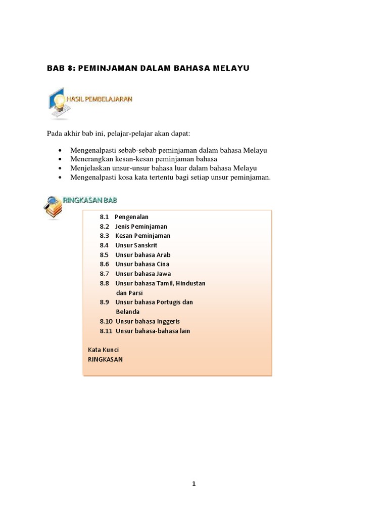 Unsur dalam bahasa melayu 1. Unsur unsur daripada bahasa asing yang diambil oleh bahasa melayu termasuklah bunyi tulisan imbuhan kosa kata istilah peribahasa dan struktur ayat. Terdapat tiga bahasa yang sangat besar pengaruhnya dalam proses peminjaman kosa kata kepada bahasa melayu iaitu bahasa sanskrit bahasa arab dan bahasa inggeris. Unsur unsur asing yang dipinjam ke dalam bahasa melayu 2.