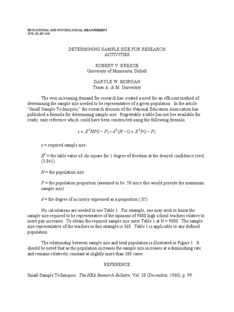 Krejcie and morgan sample size table doc. The ever increasing need for a representative statistical sample in empirical research has created the demand for an effective method of determining sample size. Krejcie morgan formula for sample size calculation the ever increasing need for a representative statistical sample in empirical research has created the dema. Krejcie robert v morgan daryle w in educational and psychological measurement. Adapted from krejcie and morgan 1970 3 4 1 exclusion criteria.