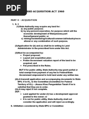 The history behind insertion of section 5a in the act of 1894 seems to be a decision of the division bench of calcutta high court in j e d. Seksyen 3 land acquisition act 1960 as amended provides that the state authority may acquire property. Interestingly section 15 of the just terms act does not expressly require a pan to include a statement specifying the public purpose justification for the acquisition. Singapore s land acquisition act gave the state power to acquire land for any public purpose from private landowners at below market prices.