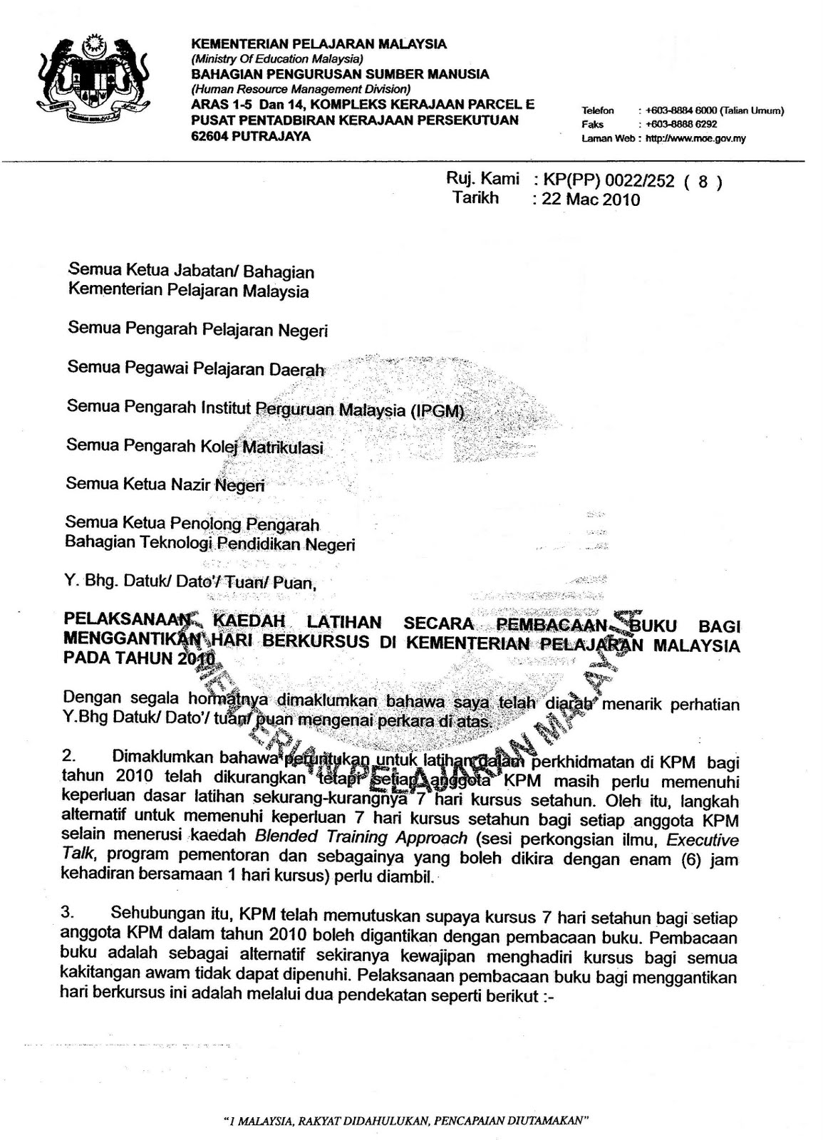 Kpm telah menetapkan para guru perlu melengkapkan latihan sekurang kurangnya 5 hari setahun selaras dengan pekeliling perkhidmatan kpm.