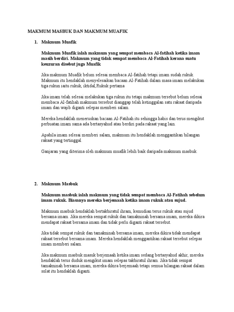 Ketika makmum mula mengikuti imam sekurang kurangnya imam sudah pun membaca al fatihah dan makmum tidak sempat menghabiskan bacaan al fatihah apabila imam rukuk. Apa maksud masbuk dan muafik. Makmum muafik adalah mereka yang berjemaah bersama imam dan sempat menghabiskan bacaan surah al fatihah di dalam qiam imamnya. Sekiranya semasa makmum masuk untuk solat jemaah.