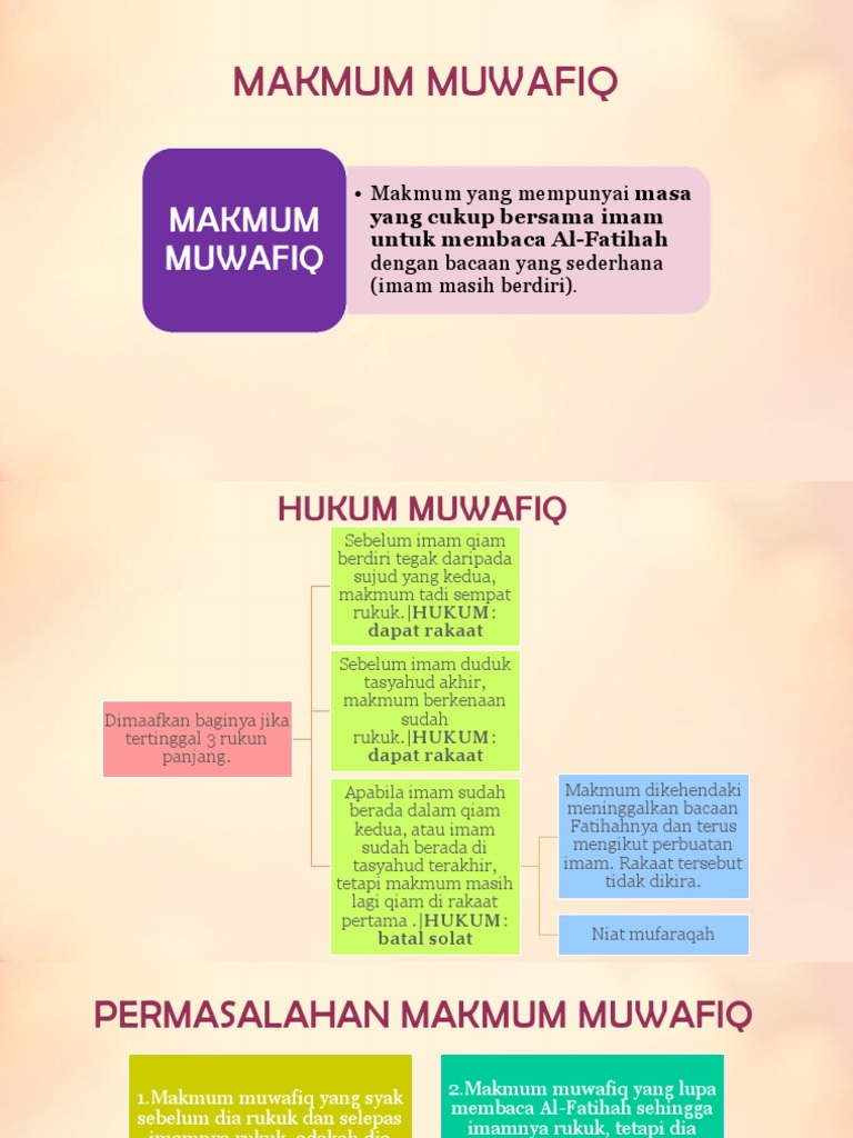 Makmum masbuk makmum masbuk ialah makmum yang tidak sempat solat bersama imam dari awal takbiratulihram. Dan jika makmum ini tidak sempat masa membaca fatihah ketika itu maka ia adalah masbuk maka bacalah apa yang dia sempat dari fatihah dan apabila imam rukuk maka makmum tersebut wajib rukuk bersama imam kitab nihayah zain makmum muwafiq. Makmum masbuk ialah yang tidak sempat mengikuti imamnya kerana tidak mempunyai waktu yang cukup untuk dapat digunakan membaca fatihah makmum muwafiq ialah yang mempunyai cukup waktu mengikuti imamnya untuk menyelesaikan bacaan fatihah. Dan orang ini tidak dikira sebagai muqassir cuai.