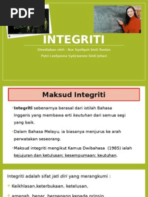 Hajr al asqalani 2000 fath al bari syarh sahih al bukhari kitab al iman bab alamat al munafiq no. Kakitangan staf atau penjawat awam yang berkualiti tinggi merupakan aset penting terhadap kejayaan sesebuah organisasi dan negara. Integriti berkait rapat dengan etika. Integriti penjawat awam pula merujuk kepada apabila seseorang menjawat apa apa sahaja jawatan yang diamanahkan dalam perkhid matan kerajaan penjawat awam terbabit perlu bertindak secara ju jur dan amanah mengikut bidang kuasa dan tugasnya telus tiada konflik peribadi berwibawa akauntabiliti serta patuh kepada segala peraturan dan undang undang yang ditetapkan.