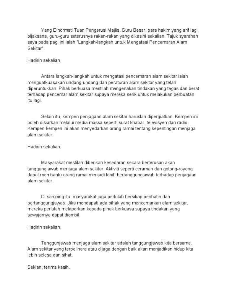 Pihak berwajib seperti kementerian sains teknologi dan alam sekitar wajar menguatkuasakan undang undang yang sedia ada untuk menghukum pihak pihak yang berkenaan. Pihak berkuasa telah menguatkuasakan undang undang baharu iaitu mengenakan denda kepada pihak yang mencemarkan alam sekitar. Jika tidak ada peraturan pasti kehidupan kita akan menjadi kacau tidak terkendali dan tidak ada ketenangan dalam hidup. Kerajaan selangor akan menguatkuasakan undang undang lebih ketat dalam menangani isu berkaitan pencemaran alam sekitar di negeri ini.