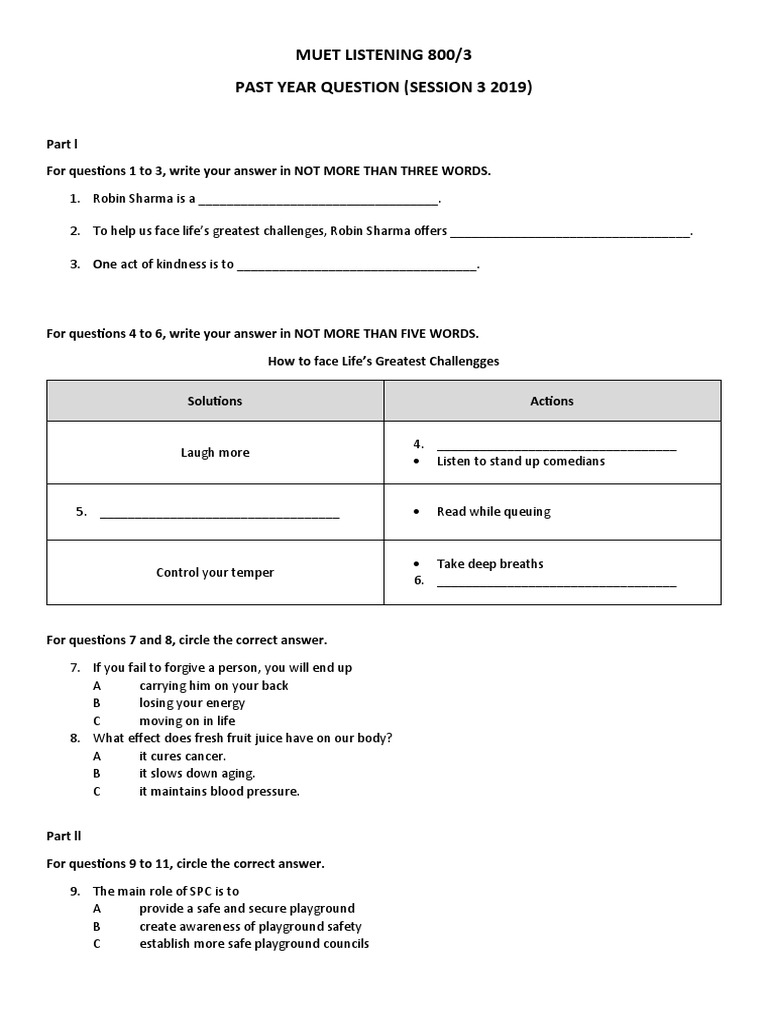 Muet listening test practice 2017. Note that these are my 1st draft answers and teachers students may leave a comment if they disagree with any of my suggested answers. For question 1 write your answer in not more than three words. Practice selective listening not every word said is important. Pre listening get an overview of the text read all the questions and answer the options carefully.