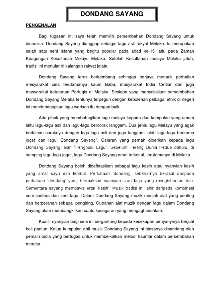 7 2 1 asal usul terdapat dua teori mengenai sejarah asal usul dondang sayang. Untuk mengatasi masalah ini kerajaan negeri melaka telah mengambil langkah dengan menjadikan dondang sayang sebagai persembahan utama dalam majlis dan upacara upacara rasmi. Muzik dondang sayang adalah perlahan dan sebuah lagu biasanya terdiri daripada 32 bar bermula dengan pengenalan biola diikuti rebana dan kemudiannya gong dan akhirnya oleh nyanyian pada bar kelima gayanya tidak formal dan liriknya biasa terdiri daripada puisi cinta. Siapakah perdana menteri malaysia ke 8.