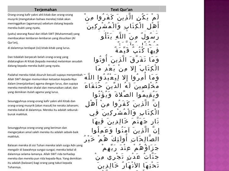Surah al bayyinah bahasa arab البينة pembuktian adalah surah ke 98 dalam al qur an surah ini terdiri atas 8 ayat termasuk golongan surat surat madaniyah diturunkan sesudah surah at talaq dinamai al bayyinah pembuktian diambil dari perkataan al bayyinah yang terdapat pada ayat pertama surat ini. Beberapa ayat yang menyebutkan bahwa al qur an sebagai petunjuk ialah dalam al qur an surat al baqarah ayat 185. Untuk lebih lengkapnya langsung saja simak ulasan lengkapnya di bawah ini. Al bayyinah adalah nama lain dari al qur an karna al qur an merupakan bukti yang nyata telah dari allah.