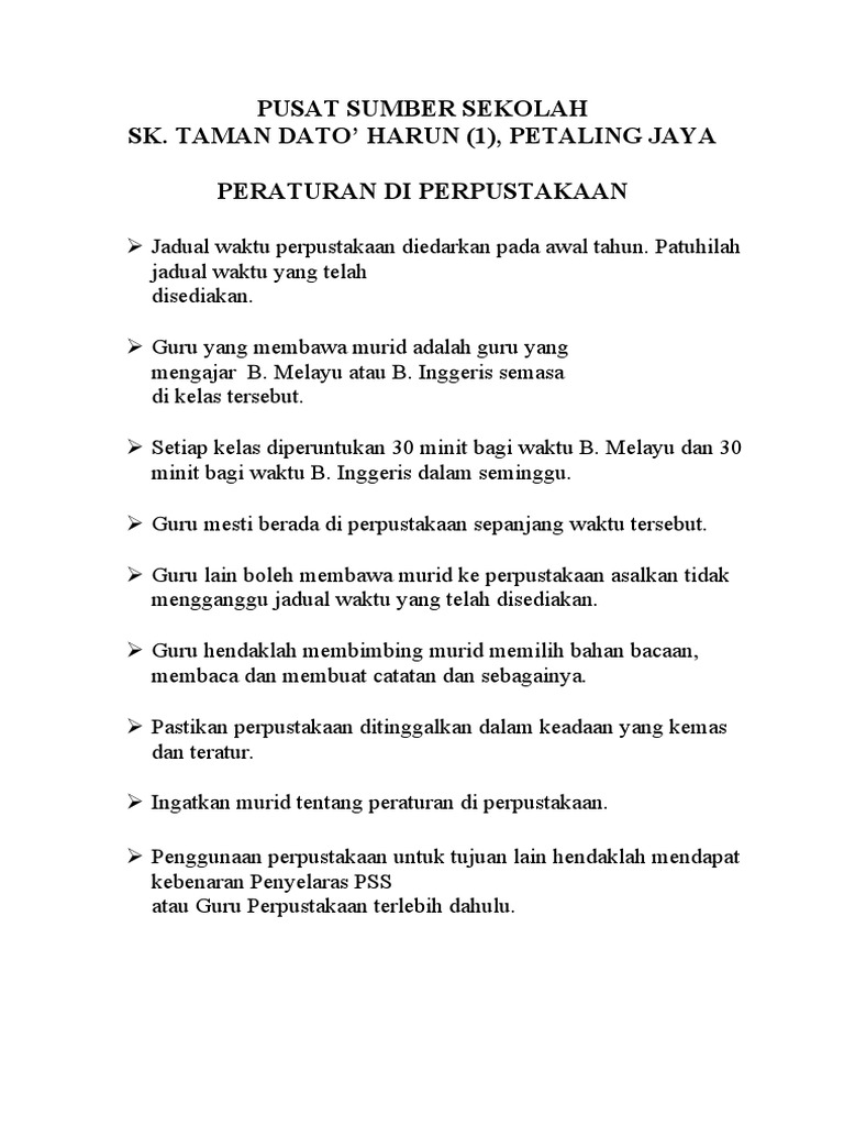 Semua pelajar yang masuk ke pusat sumber mestilah berpakaian seragam sekolah dengan kemas. Peraturan pusat sumber sekolah 1 1 peraturan am 1 2 peraturan khusus 1 3 peraturan penggunaan alat ruang 1 4 peraturan pinj.